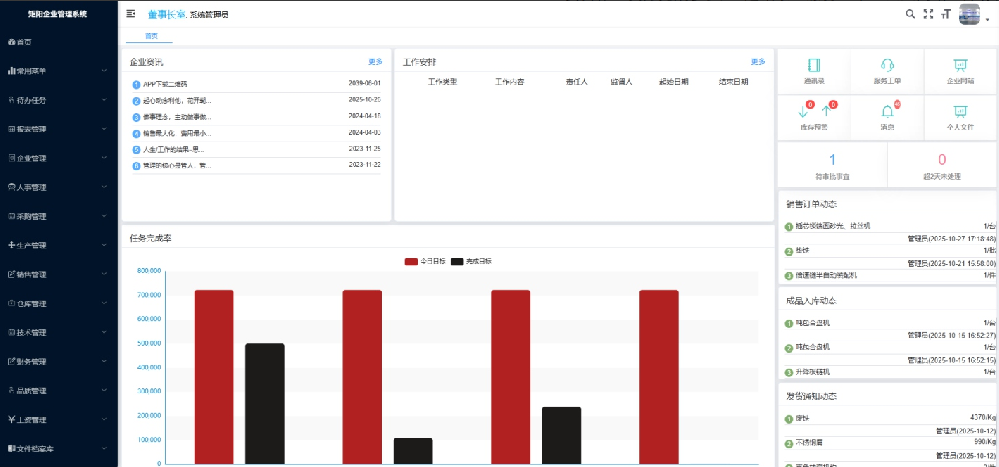 包含:企业资讯、工作安排、任务完成率(按月统计:销售目标、实际完成 多少、设计目标、实际完成多少、生产目标、实际完成多少、发 货目标、实际完成多少)、通讯录、服务工单、企业网站、库存预警、消息、个人文件、待审批事宜超2天未处理、销售订单动态、成品入库动态、发货通知动态等。